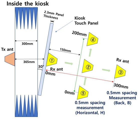 Scenario 2 (Figure 4): The transmitter and receiver remain parallel, but the kiosk panel is tilted forward by 30°, increasing the transmitter-to-panel distance to 365 mm. The receiver movement and measurement intervals are identical to those in Scenario 1.