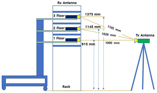 The kiosk data downloading scenario was designed to emulate a mobile service environment where users interact with a polyethylene terephthalate (PET) panel, typically 2.3 mm thick. In this experiment, the distance between the transmitter and the panel was fixed, while the distance between the panel and the receiver was varied. Three horn antennas with beamwidths of 10°, 30°, and 60° were used for both transmission and reception, maintaining matched polarization and gain characteristics. To minimize internal reflections, radio wave absorbers were attached inside the kiosk enclosure. The overall measurement configuration for this scenario is shown in Figure 2. Three specific sub-scenarios were examined to analyze delay spread characteristics under different geometric conditions.