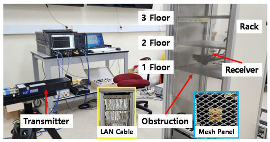 Experimental measurements were carried out to evaluate inter-rack communication performance in a representative data center environment. In this scenario, the transmitter was fixed at a constant distance from a small wired mesh panel with a thickness of 0.3 mm, while the distance between the panel and the receiver was systematically varied. Horn antennas with beamwidths of 30° and 60° were employed at both the transmitter and receiver sides, and matched antenna pairs were used to ensure consistent measurement conditions. The measurement setup is illustrated in Figure 6 and Figure 7. To analyze spatial variations in received signal characteristics within the rack, the receiver antenna was translated along two orthogonal directions inside the rack structure, denoted as the “back” and “horizontal” directions. Figure 8 provides a top-down view of the setup shown in Figure 6, offering a planar representation of the receiver’s motion path relative to the fixed transmitter. Along each direction, measurements were acquired at 3 mm intervals over a linear track. After completing a measurement sweep at one vertical level, the receiver was repositioned vertically, and the same process was repeated at the new height, as depicted in Figure 8. To replicate realistic inter-rack deployment conditions, common obstructions such as LAN cables and small wired mesh panels were deliberately introduced inside the rack. These obstructions emulate the impact of practical environmental clutter on propagation characteristics and are critical in understanding delay spread behavior in data center scenarios.