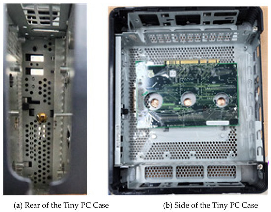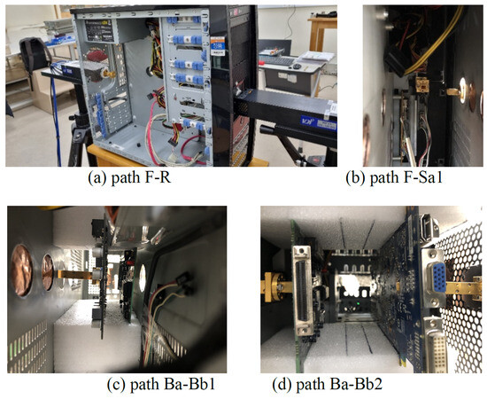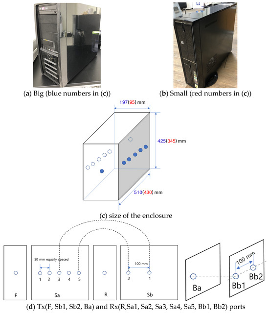 To construct the intra-device measurement environment, two types of desktop computer cases—one large and one small—were selected, with certain internal components intentionally left intact to emulate realistic internal structures. Line-of-sight (LoS) propagation was maintained between the transmitter and receiver antennas to ensure consistency in the measurement conditions. Figure 9a,b depict the exterior of the large and small PC cases, respectively, while Figure 9c presents the dimensional specifications of each case. The specific port holes used for antenna placement, including their relative positions and exact circuit board locations, are illustrated in Figure 9d. Multiple propagation paths within each case were defined and are shown in Figure 10. Among them, Figure 10a,c represent straight-line paths, while Figure 10b shows a 90-degree bent path and Figure 10d depicts a slanted path. The separation distances between the transmitter and receiver antennas for all paths of the big case and small case are summarized in Table 2. For each measurement, only one antenna port was opened at a time, while all remaining ports were sealed using metallic tape to minimize unwanted signal leakage, as illustrated in Figure 11 and Figure 12. After performing vector network analyzer (VNA) calibration, reference power levels were established to normalize the received signal power. Delay spread characteristics were then extracted from the measured power delay profiles (PDPs), and the distances used for these analyses of the tiny case are listed in Table 3.