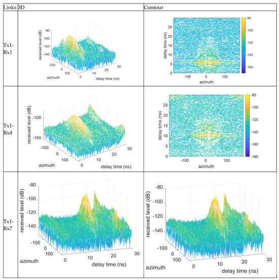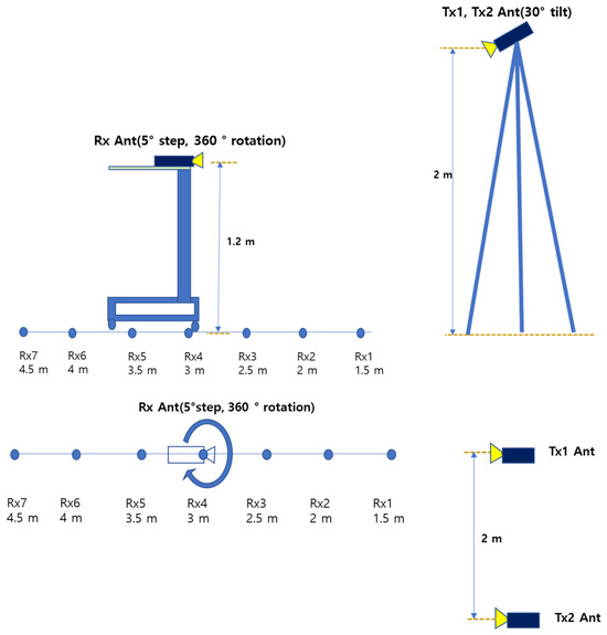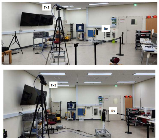 Experimental measurements were carried out in a confined laboratory space measuring 11 m × 17 m to investigate delay characteristics under controlled indoor conditions. All transmit antennas were installed at a height of 2 m and tilted downward by 30°, while receive antennas were positioned at a height of 1.5 m. The distance between the transmitter and receiver was varied from 1.5 m to 4.5 m in 0.5 m increments, resulting in corresponding spatial separations ranging from 1.7 m to 5.0 m due to the angular tilt. For all measurements in this scenario, both the transmitting and receiving antennas were configured with a beamwidth of 60°. To capture the angular diversity of incoming signals, the receiver antenna was rotated in 5° steps through a full 360° azimuthal sweep at each position. Figure 13 illustrates the side and top views of the antenna arrangements and movement trajectories. Among the measured links, the shortest separation occurred between transmitter location 1 and receiver location 1, while the longest was observed between transmitter location 2 and receiver location 7. Figure 14 shows photographs of the actual measurement setup, including equipment placement at the designated transmitter locations within the laboratory environment.