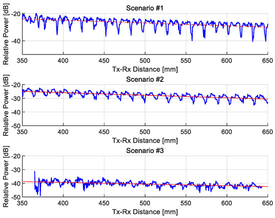 In this section, the measurement results for all scenarios conducted in the kiosk data downloading environment are analyzed in terms of the root-mean-square (R.M.S.) delay spread. Figure 15 illustrates the variation in relative received power as a function of the distance between the transmitting and receiving antennas. While the absolute values along the y-axis differ depending on the specific measurement scenario, a general trend of decreasing received power with increasing distance is observed on a large-scale basis. However, on a finer scale, localized increases in received power are also detected at certain distances, indicating the presence of small-scale fading phenomena. These fluctuations are likely caused by multipath reflections and constructive interference, which become more pronounced as the distance between the antennas increases. The superposition of these effects highlights the importance of accounting for both large- and small-scale propagation characteristics in analyzing R.M.S. delay spread within the kiosk-based service environment.