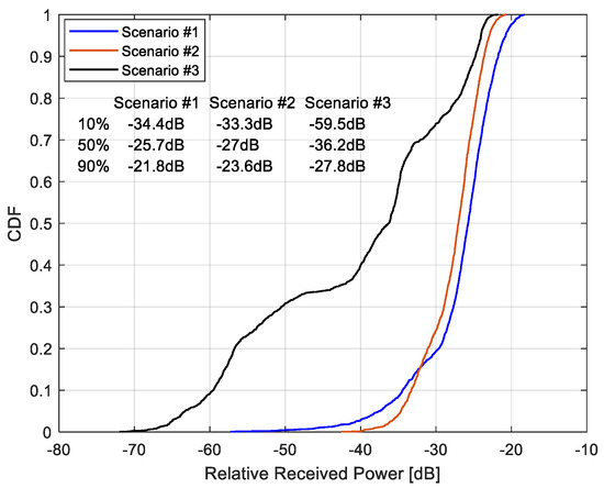 Figure 16 presents the cumulative distribution function (CDF) of the relative received power for all three kiosk scenarios. The graph illustrates the power levels corresponding to the 10%, 50%, and 90% percentiles, offering a comparative view of power distribution trends across different geometric configurations. These results are derived with a consideration of the antenna beamwidths—10°, 30°, and 60°—as implemented in each scenario. Figure 17 shows the CDF of the R.M.S. delay spread obtained using measurement data collected from all kiosk scenarios (Scenarios #1 to #3), including both back and horizontal movement directions. The analysis reflects the combined impacts of varying antenna beamwidths and measurement geometries on delay spread behavior.