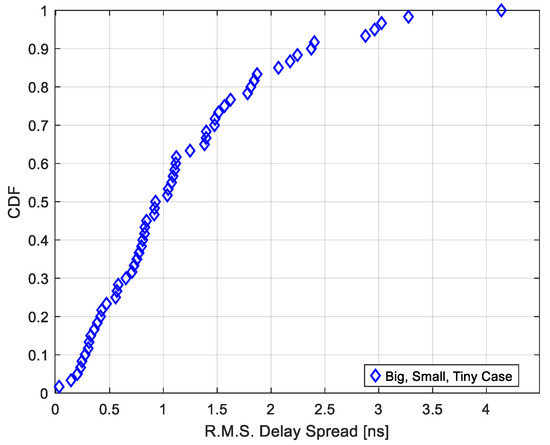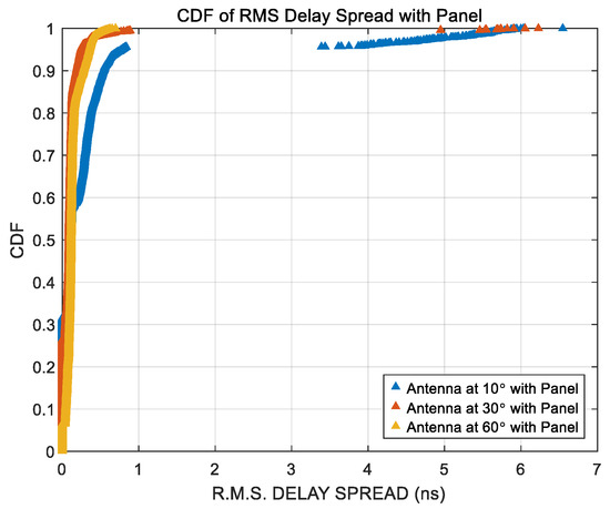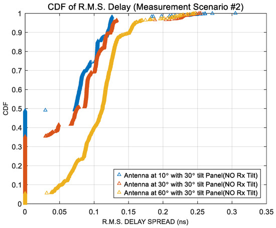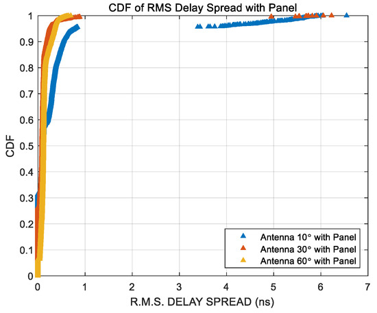 In the experimental measurement Scenario #3, as illustrated in Figure 5, the proportion of R.M.S. delay spread values exceeding 1 nanosecond was analyzed based on the antenna beamwidth. The corresponding results are summarized in Table 6. It is evident from the table that narrower beamwidths, particularly 10°, result in a higher percentage of excessive delay spread, indicating increased multipath effects due to refraction or scattering caused by the kiosk panel. Figure 21 presents the cumulative distribution function (CDF) of the R.M.S. delay spread under the condition where the receiver antenna is tilted by 30°, but the kiosk panel is removed. When compared to the CDF of Scenario #3, where the panel is present, it becomes clear that the removal of the panel significantly reduces the distribution range of delay spread. This finding confirms that the presence of the kiosk panel plays a critical role in extending delay times due to signal refraction and internal reflections.