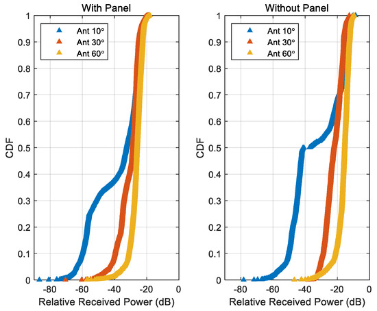 Figure 22 shows the CDF of relative received power with and without the kiosk panel for each antenna beamwidth. The relative received power was calculated as the ratio between the measured power and the reference power, which corresponds to the received power at a distance of 10 cm for each beamwidth. The results indicate that received power increases as the antenna beamwidth widens. When averaged across all beamwidths, the total received power was −32.17 dB with the panel and −23.97 dB without it, indicating an average attenuation of approximately 8.2 dB due to the panel. Detailed values of received power for each beamwidth and panel condition are presented in Table 7.