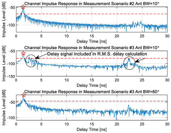 Figure 23 illustrates the impulse response level as a function of delay time, categorized by antenna beamwidth and measurement scenario. The first graph in Figure 23 corresponds to Scenario #2 using a 10° antenna beamwidth. In this plot, the star symbol denotes the peak value of the channel impulse response (CIR), while the red dotted line represents the threshold level, defined as 20 dB below the peak. As per the methodology adopted in this study, only signal components below this threshold are regarded as contributing to delay spread. Accordingly, no delayed signals are observed beyond 5 ns on the time axis in this scenario. The second graph shows the CIR under Scenario #3 with the same 10° beamwidth. Similar to Scenario #2, delayed signal components are not present beyond the 5 ns mark, indicating limited multipath spread under these specific conditions. In contrast, the third graph depicts the results for Scenario #3 using a 60° antenna beamwidth. In this case, additional delayed signals—attenuated below the 20 dB threshold—are observed within the 20 to 25 ns range. The presence of these late-arriving components implies a broader temporal dispersion and, consequently, a larger R.M.S. delay spread. This outcome highlights that, particularly in Scenario #3, both narrow (10°) and wide (60°) beamwidth configurations can yield extended delay profiles due to differing interactions with the kiosk panel and propagation environment.