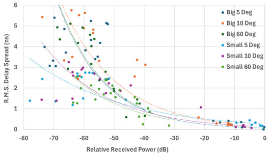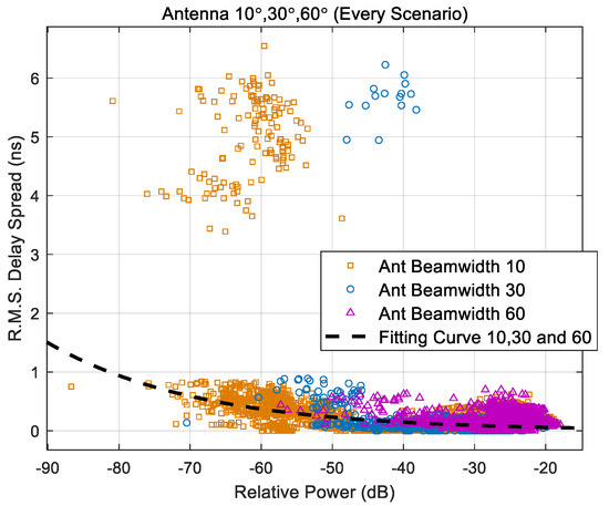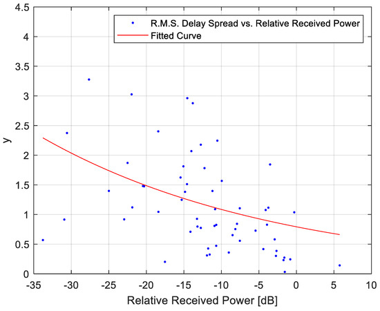 The path loss value L in Equation (1) can be equivalently represented by a negative-valued received power, allowing the model to be reformulated as Equation (2). To determine the coefficients A and B for this path loss-based delay spread model, a curve fitting procedure was applied to the measurement data presented in this study. The resulting coefficient values for each antenna beamwidth are summarized in Table 8. Curve fitting was carried out using the Curve Fitting Toolbox in MATLAB R2022b. Specifically, a robust least squares regression method with bi-square weighting was employed to minimize the influence of outliers and enhance the reliability of the model. This approach ensures a more accurate representation of the empirical relationship between received power and R.M.S. delay spread across different antenna configurations.