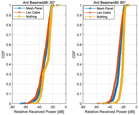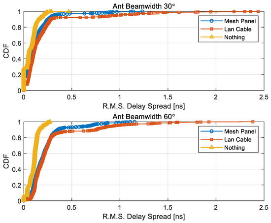 Figure 25 presents the cumulative distribution function (CDF) of the relative received power for antenna beamwidths of 30° and 60°, categorized according to the types of obstructions placed between the transmitter and receiver. The relative received power is calculated as the ratio between the measured power and the reference power, where the reference power corresponds to the signal strength measured at a distance of 10 cm for each beamwidth configuration. As expected, the relative received power increases with the widening of the antenna beamwidth due to the broader angular coverage. Figure 26 shows the CDF of the R.M.S. delay spread for each obstruction type—namely, a small mesh panel, a LAN cable, and the case with no obstruction (denoted as “Nothing”)—under 30° and 60° antenna beamwidth conditions. The results indicate that the absence of obstructions results in a narrower delay spread distribution, whereas the presence of obstacles such as mesh panels or LAN cables introduces additional multipath components, thereby increasing the delay spread. This observation confirms that environmental clutter significantly impacts temporal dispersion characteristics, especially when wider beamwidth antennas are employed. The specific values corresponding to the 10%, 50%, and 90% CDF percentiles of R.M.S. delay spread under each configuration are summarized in Table 9.