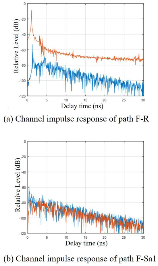 Figure 27 illustrates representative examples of the channel impulse responses for the F–R and F–Sa1 paths in the intra-device measurement scenario. In the figure, the orange line corresponds to the response measured using a 5° beamwidth antenna, while the blue line indicates the result for a 60° beamwidth antenna. The x-axis represents the R.M.S. delay spread in nanoseconds, and the y-axis shows the relative received power level in decibels (dB). Table 10 summarizes the measured values of relative received power and R.M.S. delay spread for all defined propagation paths within the device. The relative received power values were obtained by summing the magnitudes of phase-resolved channel impulse responses, referenced to the calibration level of the transmitter and receiver antennas. Based on these results, R.M.S. delay spread models were developed as a function of the relative received power. To account for structural differences, the delay spread models were categorized according to the physical size of the device enclosure (e.g., large vs. small case). Figure 28 presents the R.M.S. delay spread as a function of relative received power, using the data compiled in Table 11. The resulting trends reveal a clear distinction based on device size; however, no significant correlation is observed with respect to antenna beamwidth. Therefore, for intra-device environments, the R.M.S. delay spread can be more accurately modeled by considering the combination of received power and case size, rather than antenna directivity. One such model follows the general form of Equation (1), where A and B are empirically derived coefficients and L denotes path loss.