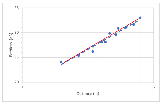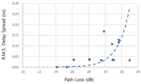 Figure 35 presents the relationship between the R.M.S. delay spread and path loss, as derived from the experimental measurement results in the laboratory environment. The delay spread values were calculated from multipath components extracted from the power delay profiles (PDPs), applying a threshold level set at 20 dB below the peak signal amplitude. The observed trend demonstrates that the R.M.S. delay spread increases with greater path loss, indicating more significant temporal dispersion under weaker received signal conditions. This relationship can be effectively characterized by an exponential function, capturing the nonlinear growth of delay spread with increasing signal attenuation.