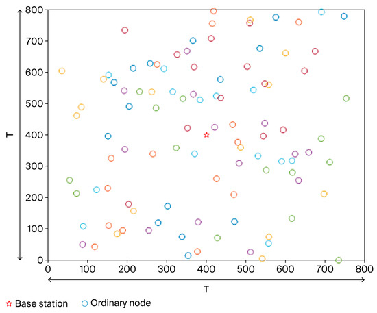 The topology structure of the wireless sensor network (WSN) in this article is shown in Figure 1. Figure 2 illustrates the corresponding network simulation scenario, where N sensors of the same type are randomly distributed within a T × T range. Each circle represents a sensor, and the five-pointed star in the center represents the base station. The color of the circles in Figure 2 carries no significance. Wireless sensor networks are extensively utilized in industrial applications of the Internet of Things to precisely process node information and ensure continuous and stable data transmission between the base station and the nodes [19,20]. Nodes can independently select appropriate transmission power levels based on the energy drain model. To mitigate the impact of adverse weather conditions and external factors such as human activities, network nodes must meet certain requirements, and the following statements must be true:
