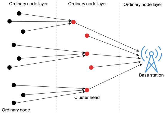 From the perspective of network topology, the WSN is composed of three tiers: sensor nodes, cluster heads, and the base station, as depicted in Figure 3.