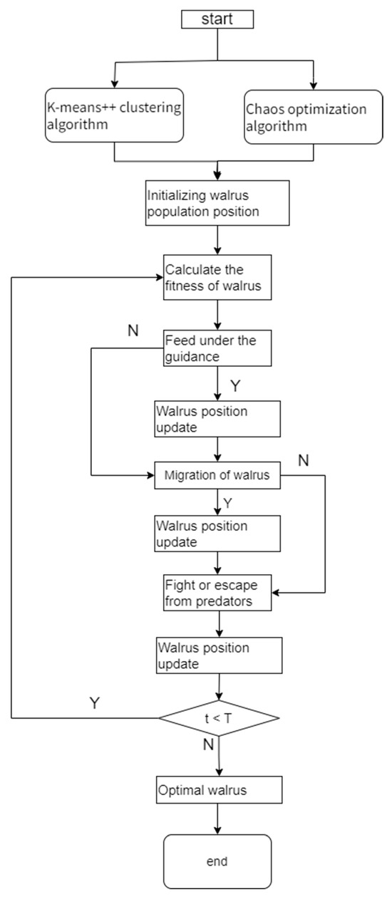 The walrus positions are initialized by integrating K-means++ and chaotic mapping.