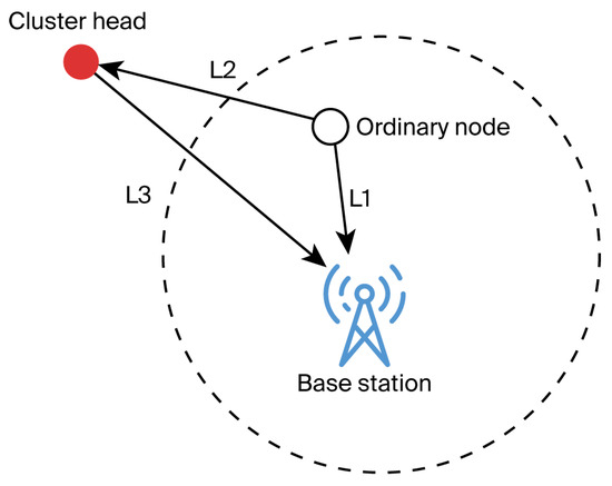 The emergency communication network is mainly divided into three communication modes: First, intra-cluster communication involves data exchange within the same cluster. Since transmission is limited to cluster members, this approach reduces energy drain in wireless sensor networks [21]. Second, during inter-cluster communication, when users belong to different clusters, shared intermediate nodes forward the data to their corresponding cluster heads, which then transmit the messages to the destination cluster head. Third, in the case of communication between nodes in different clusters, data are transmitted hierarchically; ordinary nodes report upward through the cluster hierarchy and ultimately communicate via the base station [22].
