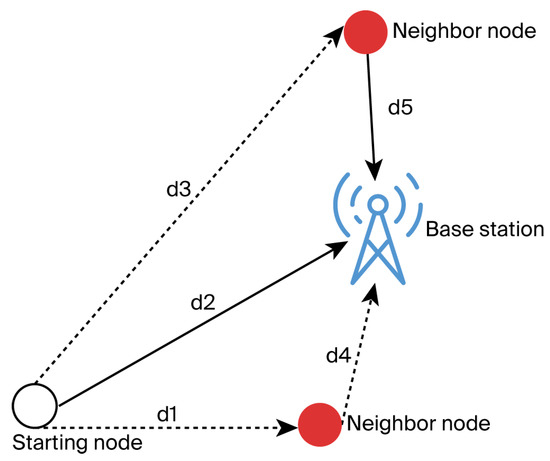 All nodes can receive data sent by other nodes—even those located near the base station. As presented in Figure 5, nodes transmit data to their respective cluster heads, which then perform data aggregation and forward the information to the base station. This results in an inefficient data flow pattern; data are initially transmitted outward before being rerouted back toward the base station.