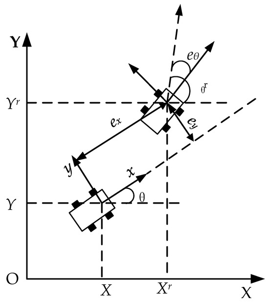 During the trajectory tracking process, the mobile robot must determine the error between its actual pose and the desired pose in real time in order to promptly adjust its control strategy. When tracking a given reference trajectory, the trajectory tracking diagram can be simplified to that shown in Figure 2. The variables and denote the true and desired positions of the mobile robot, respectively, and the relationship between these positions is given by the following kinematic equations: