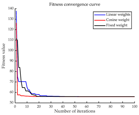 To compare the effectiveness of the three weighted updating methods, we choose a circular reference trajectory for simulation, whose specific parameters are given in Section 6.1, and the fitness convergence curve is shown in Figure 6.