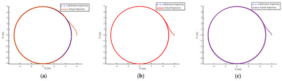 Circular trajectory tracking results: (a) conventional LQR (fixed Q, R); (b) PSO−optimized LQR; (c) reference [33] method.