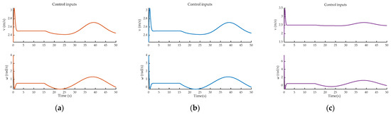 Circular trajectory control inputs: (a) conventional LQR (fixed Q, R); (b) PSO−optimized LQR; (c) reference [33] method.