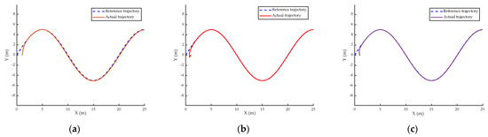 Sine wave trajectory tracking results: (a) conventional LQR (fixed Q, R); (b) PSO−optimized LQR; (c) reference [33] method.