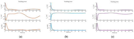 Circular trajectory tracking error: (a) conventional LQR (fixed Q, R); (b) PSO−optimized LQR; (c) reference [33] method.