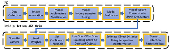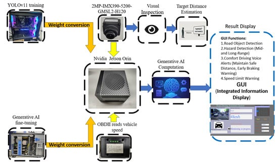 First, the YOLOv11 (v11.0, Ultralytics, Frederick, MD, USA) Python 3.10, PyTorch 1.13.0, CUDA 11.7, etc. [] model is trained, and its weights are converted and deployed onto the Jetson AGX Orin Developer Kit (NVIDIA, Santa Clara, CA, USA), an embedded platform. A real-time video stream is captured using a camera SG2-IMX390C-5200-GMSL2-H120H (Shenzhen SENSING Technology Co., Ltd., Shenzhen, Guangdong, China). The system reads the vehicle’s current speed in real time via an OBD-II device and, in combination with the generative AI module, infers the distance to detected objects ahead and potential driving risks. Finally, the inference results are integrated into a GUI interface, providing functionalities such as speed limit warnings, distance alerts, voice prompts, and road object recognition.