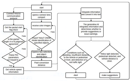 This section describes the system architecture and overall operational flow of the proposed framework. As shown in Figure 1, the intelligent driving assistance system developed in this study integrates object detection, vehicle speed acquisition, distance estimation, and generative AI-based inference to provide real-time and accurate driving alerts and informational prompts.