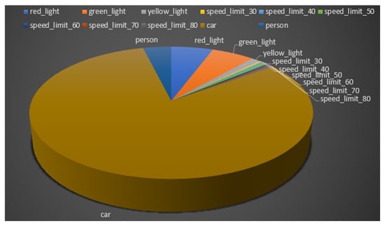 The annotated categories cover 11 classes: speed limits from 30 km/h to 80 km/h, traffic lights, pedestrians, and vehicles. We adopted a fixed split for training and testing, with 2341 images (80%) used as the training set and 585 images (20%) as the testing set, for a total of 2926 images in the training-validation split. Figure 4 and Figure 5 show the 11 training categories and the distribution of annotations, while Table 1 lists the label IDs for each category.