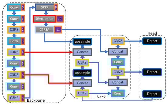 Regarding the Cross Stage Partial with Kernel-2 Fusion Module (C3K2) in YOLOv11, it is a variant of the C3 module introduced in early YOLOv7. Its primary function is feature extraction, combining convolutions with two different kernel sizes to enhance the model’s ability to perceive objects at multiple scales. In the backbone structure shown in Figure 6, the model builds hierarchical features from layers 0–7. Layers 9–11 perform feature refinement and fusion, where layer 9 is Spatial Pyramid Pooling-Fast (SPPF), using multiple pooling operations to fuse multi-scale features; layer 10 strengthens key channel features; and layer 11 integrates channel and spatial attention to further refine and enhance the information.