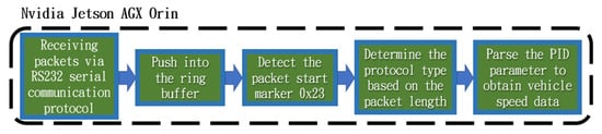 For vehicle speed acquisition, the system connects to the OBD-II device via the RS232 communication protocol. It receives packet data that conforms to a predefined format (e.g., with a starting flag of 0 × 23 and length verification) and parses the Parameter ID (PID) values to obtain real-time vehicle speed information.
