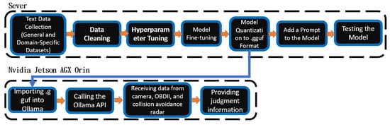 To deploy Breeze:7B on the Jetson AGX Orin Developer Kit, it is essential to minimize computational load during runtime []. Therefore, the fine-tuning strategy adopted in this study involved dividing the dataset into two categories: a general-purpose dataset, which contains question-and-answer pairs relevant to the overall research context, and a domain-specific dataset, which focuses on critical alert-related targets such as red lights, speed limit signs, and dangerously close objects [].