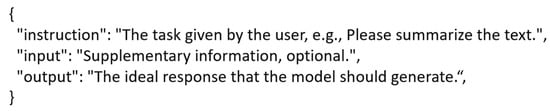 During the fine-tuning of Breeze:7B, it was necessary to prepare appropriate training data, as illustrated in Figure 10. This study adopted a structured JSON format, with each training sample composed of three fields, instruction, input, and output, following the format used in Alpaca [] and the LLaMA Factory framework.