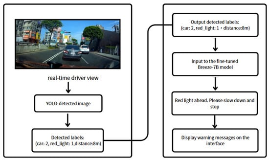 All acquired information—including image recognition results and vehicle speed data—is integrated into the generative AI module for semantic understanding and inference. The AI model determines whether to issue alerts (such as overspeed warnings, insufficient distance to the vehicle ahead, or red light detection) or provide driving suggestions (such as pedestrian presence or yellow light status). Finally, the inference results are converted into textual messages, which are either displayed on the user interface or delivered via voice prompts to enhance driving decision support and improve the overall user experience [].
