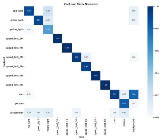 Figure 12 shows the normalized confusion matrix results of the proposed model on the test dataset. It can be observed that most categories are accurately recognized by the model, with values along the diagonal close to 1, indicating strong classification performance in these classes. For example, traffic sign categories such as speed_limit_30 to speed_limit_80 all achieved 100% prediction accuracy, demonstrating the model’s high recognition capability for numeric speed limit signs.