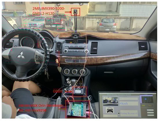 Figure 13 shows the installation of the hardware modules on the vehicle, which include the automotive-grade camera, OBDII module, Jetson AGX Orin Developer Kit, and the MAX9296 development board. The experimental vehicle used in this study is a Mitsubishi Lancer Fortis/iO.