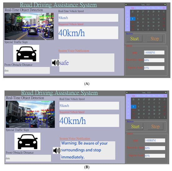 Figure 14 presents the results of on-road testing, where Figure 14A illustrates a safe scenario and Figure 14B illustrates a warning scenario. The system demonstrated good stability during the tests, as seen in the GUI outputs in Figure 14, where the object bounding boxes are accurately drawn.