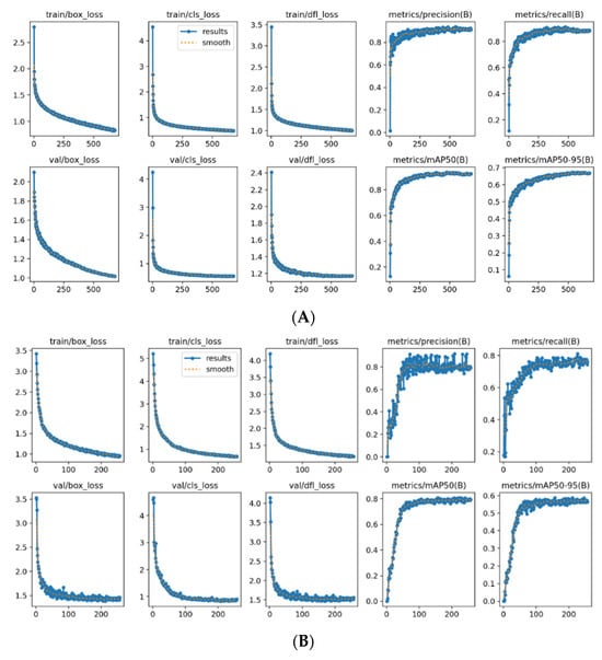Compared to the original YOLOv11 model [], the experimental results show that the addition of SEAttention improves both accuracy and mAP50–95, as well as the overall convergence behavior. As shown in Figure 15B, when trained using the same hyperparameters and dataset, the baseline YOLOv11 exhibited greater oscillation in its training loss curve.