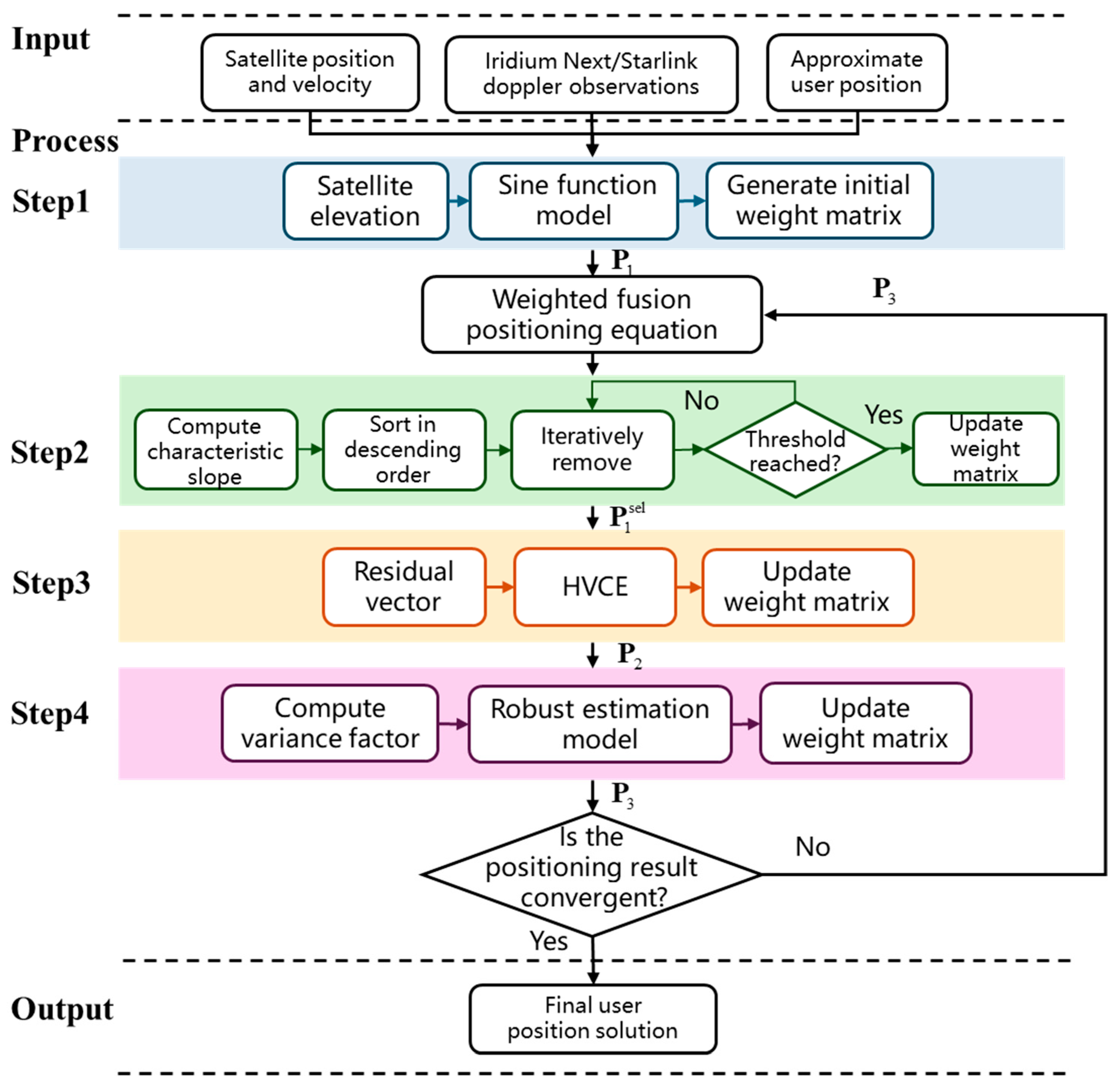 This study embeds the weight estimation and updating process within the iterative framework of dual-constellation fusion Doppler positioning. During the positioning process, observation selection and weight optimization continue until the results satisfy the convergence criterion. The final user position is then stably determined.