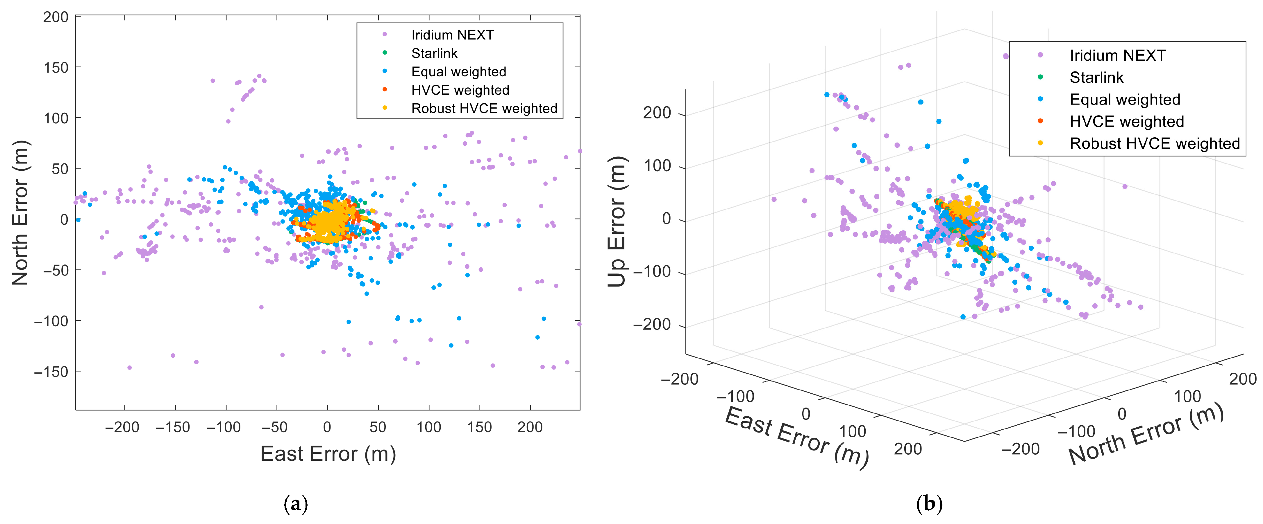 Table 3, introducing outliers leads to distinct performance changes across algorithms. Iridium NEXT single-constellation positioning consistently attains the lowest accuracy and exhibits further error increases once outliers are present. Starlink single-constellation positioning achieves higher accuracy overall, yet its performance also declines under contaminated observations. The equal-weighted fusion is inherently influenced by the larger positioning errors associated with Iridium NEXT; adding outliers further steers the solution toward poorer accuracy. Conventional HVCE weighting shows a certain degree of stability, with only moderate increases in error; however, the proposed Robust HVCE consistently achieves the smallest errors and exhibits relatively small changes compared with the uncontaminated case, thereby demonstrating superior robustness to data contamination.