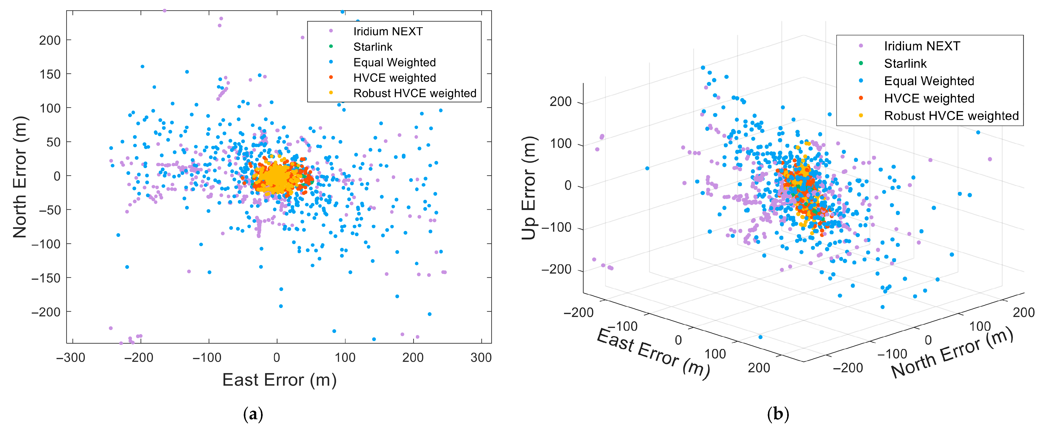 Table 2, Doppler positioning with Iridium NEXT yields the lowest accuracy. The equal-weighted combination with Starlink performs better, while the weighted positioning algorithm based on the Robust HVCE model achieves the highest accuracy. Doppler positioning using Starlink signals results in relatively small errors. However, when these signals are combined with Iridium NEXT signals using equal weights, the substantial accuracy disparity between the two constellations causes the Iridium NEXT observations, which have higher noise levels, to disproportionately influence the final solution. This reduces the overall positioning accuracy to a level inferior to that achieved using Starlink alone. By determining the weights of Iridium NEXT and Starlink observations through HVCE, the positioning accuracy is enhanced relative to both single-constellation solutions and equal-weighted integration. The Robust HVCE model further improves positioning accuracy over standard HVCE weighting by effectively mitigating the impact of outliers. Overall, the proposed algorithm achieves 12.8 m 2D positioning accuracy and 23.2 m 3D positioning accuracy, delivering at least a 29% improvement over the HVCE-weighted positioning algorithm.