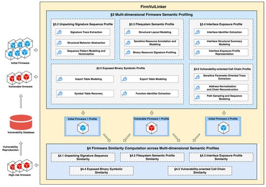 To enable the large-scale analysis of homologous vulnerability propagation across heterogeneous embedded firmware images, we propose FirmVulLinker. This unified static profiling framework models firmware semantics in a structured, platform-independent manner. The framework performs multi-dimensional profiling to capture key features of firmware, facilitating cross-sample semantic alignment and homologous vulnerability discovery. The overall system architecture of FirmVulLinker is illustrated in Figure 1.