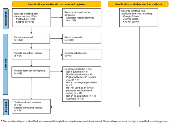 A comprehensive literature review was conducted to find potentially relevant articles from MEDLINE/PubMed and Scopus databases (see Appendix A). A total of 1064 records were identified (PubMed: 186, Scopus: 878). After removing 192 duplicates, 872 records were screened by title and abstract. Of these, 808 were excluded as irrelevant, leaving 64 articles for full-text assessment, of which 29 met the inclusion criteria and were selected for data extraction. To ensure that no recently published or poorly indexed studies were missed, a brief, targeted supplementary search was performed after the primary PubMed and Scopus search: five additional records were retrieved. In total, 34 studies (29 from database searches and 5 from supplementary sources) [67,68,69,70,71,72,73,74,75,76,77,78,79,80,81,82,83,84,85,86,87,88,89,90,91,92,93,94,95,96,97,98,99,100] constitute the evidence base of the review. The process of study identification, screening, and inclusion is illustrated in the PRISMA flow chart (Figure 1). This diagram provides a step-by-step summary of the number of records retrieved, screened, excluded, and finally included in the evidence base.