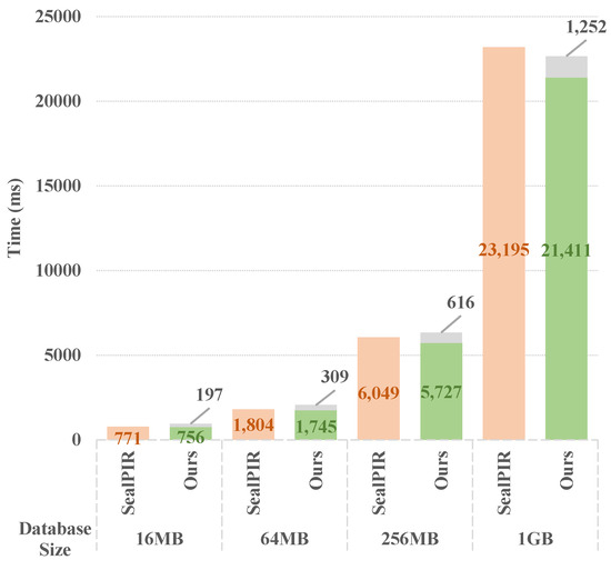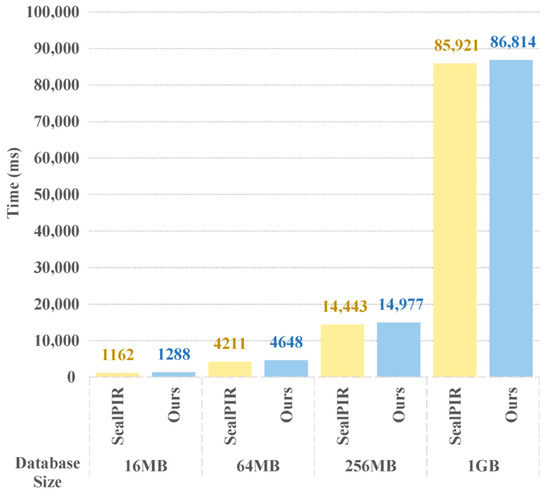 The preprocessing time of the PIR scheme is relatively long, mainly because the server needs to complete the core operations such as homomorphic encryption coding and key generation of the database in the startup phase. The initialization process of the database involves dividing the original data into blocks and encoding them into polynomial structures. This step needs to optimize the computational efficiency by number theoretic transformation (NTT), and its complexity is positively related to the scale of the data. At the same time, the generation of the Galois key needs to construct multiple rotation keys according to the degree of the polynomial ring to support the replacement operation of the ciphertext slot. The computational overhead of such key generation increases significantly with the increase in the degree of the polynomial ring. Figure 4 shows that the average time of the proposed scheme in this operation is about 126–893 ms more than SealPIR, which is mainly used for the diagonal extraction of the database matrix. However, this operation takes very little time in the whole preprocessing stage, and can be implemented offline, so it has little impact on the overall performance of the scheme.