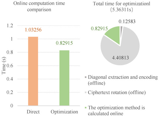 In order to further explore the vector–matrix multiplication optimization module, we selected a database size of integers, and performed 50 tests without optimizing the ciphertext rotation operation (i.e., directly multiplying the vector and the matrix), taking the average and obtaining the following results, as shown in Figure 6. The direct method takes 1.03256 s and the online calculation time of the optimized method is 0.82915 s (the total time is 5.36311 s, including 0.12583 s for diagonal extraction and encoding and 4.40813 s for ciphertext rotation), which is 0.20341 s shorter and the performance is improved by about 19.7%.