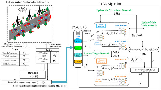 (3) The TD3 algorithm is introduced to make real-time task offloading decisions in complex and dynamic vehicular networks, improving both the efficiency and stability of decision-making.