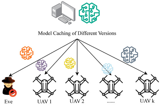 The edge server distributes the pre-trained models to mobile edge devices (UAVs) for model inference and decision-making, supporting a wide range of AI applications. However, there may be an eavesdropper (Eve) who wants to obtain private model information.
