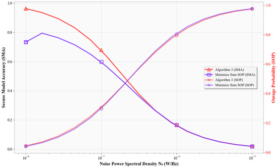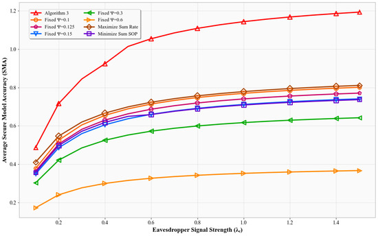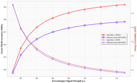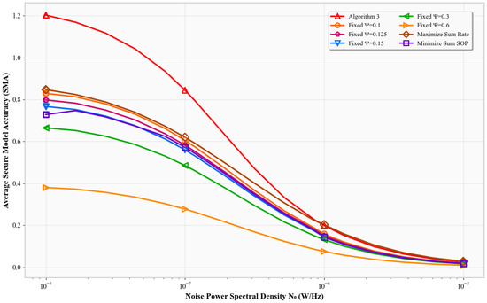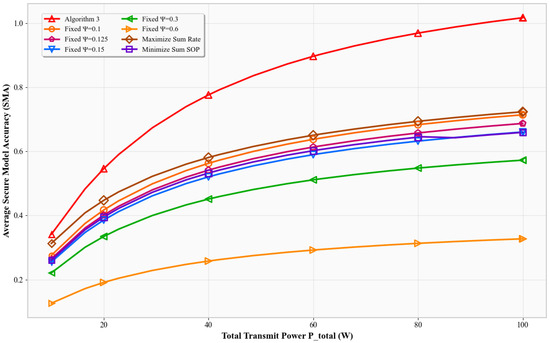 ) at the legitimate receiver decreases, reducing the channel’s capacity. Consequently, all schemes show a decline in SMA. Algorithm 3 consistently achieves the highest SMA, outperforming the fixed error-rate models, the Max-Sum-Rate scheme, and the Min-SOP scheme. Fixed-