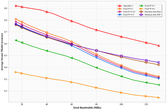 ). As a result, all schemes experience lower SMA. Algorithm 3’s accuracy drops more gently, maintaining superiority across the range. It adapts to bandwidth-induced noise by focusing on the most efficient sub-bands, whereas the others either spread power too thin or sacrifice throughput for secrecy.