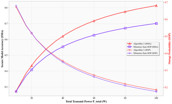 grows, all SMAs rise. Yet, Algorithm 3 achieves the best accuracy and near-optimal SOP, whereas the Min-SOP scheme ensures secrecy but loses accuracy.