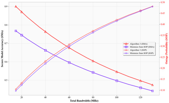Figure 7, as bandwidth increases, Algorithm 3 still preserves a better SMA–SOP tradeoff. Higher bandwidth leads to lower SNRs, raising SOP and lowering accuracy. Algorithm 3 adapts through selective power use and subband prioritization, while Min-SOP limits SMA too aggressively.